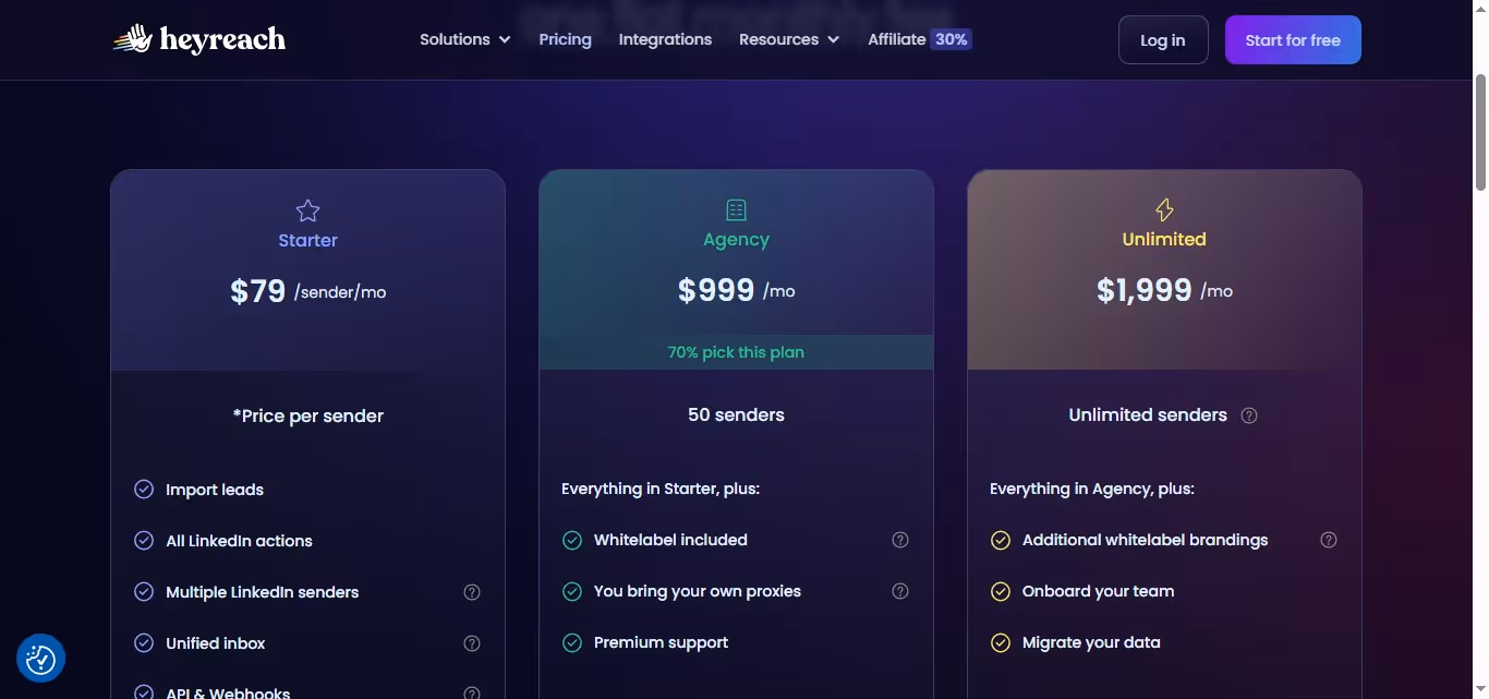 - Agency Plan $999/month for up to 50 accounts. Includes API, webhooks, and whitelabel, but you provide your own proxies.