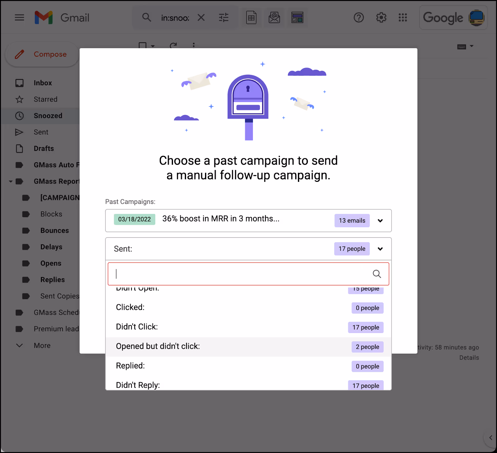 GMass lets you send campaigns to subsets of previous recipients, such as those who opened your last email or those who didn't click on a link.