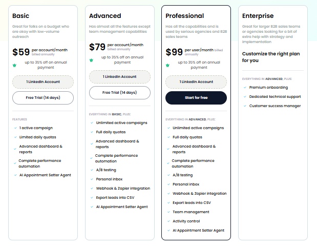LinkedHelper offers the lowest entry point with plans starting at $15/month, with a yearly purchase option. This makes it particularly appealing for individual users or small teams on tight budgets.