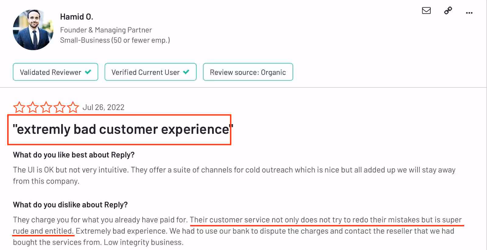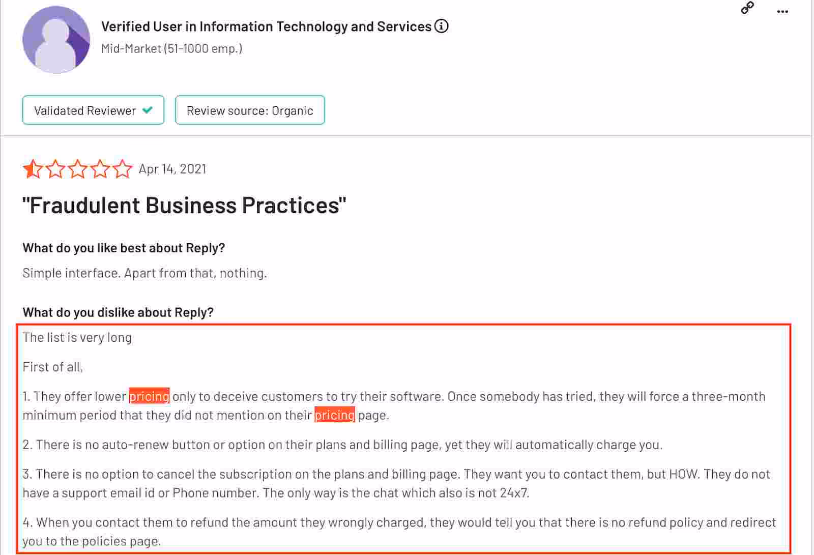 - Users have reported dissatisfaction with Reply.io, especially when it comes to billing.