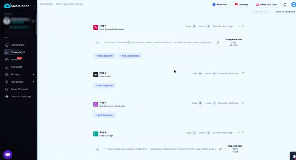 To make the connection request feel natural, Bob used SalesRobot to automate a sequence of soft touches by viewing profiles and liking posts before ever sending a message. This made him a familiar face to his prospects.